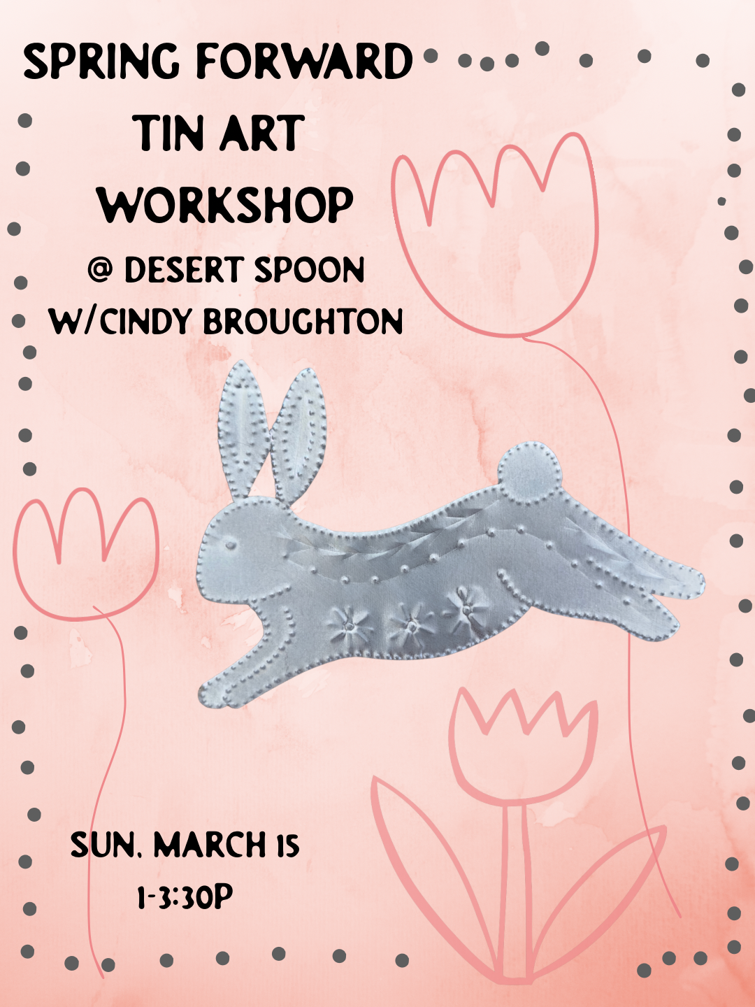 Join artist Cindy Broughton of Tularosa, New Mexico for an afternoon exploring the time-honored art of New Mexican tinwork—a craft that has flourished in the Southwest since the mid-1800s. Cindy has studied under two master tin workers, Richard Gabriel and Fred Lopez and enjoys sharing her craft w others.