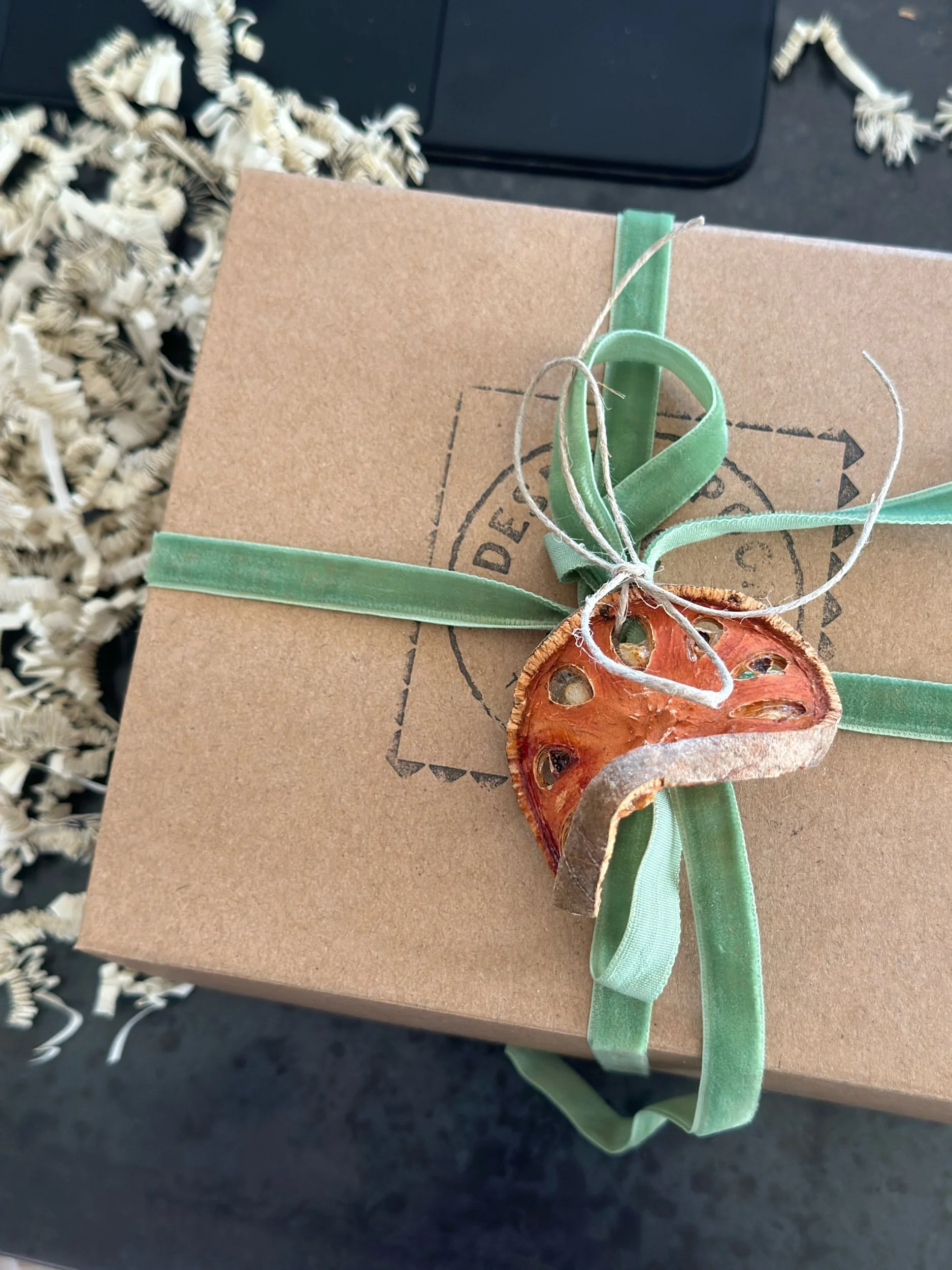 Wrapped up in a gift box with ribbon, dried fruit and gift card.